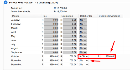 - Set the Debit Order Submission Date (the date the parent chose for their debit order).