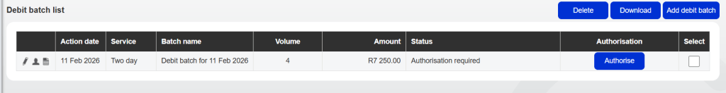 Navigate to Services> Debit Orders> Debit batches