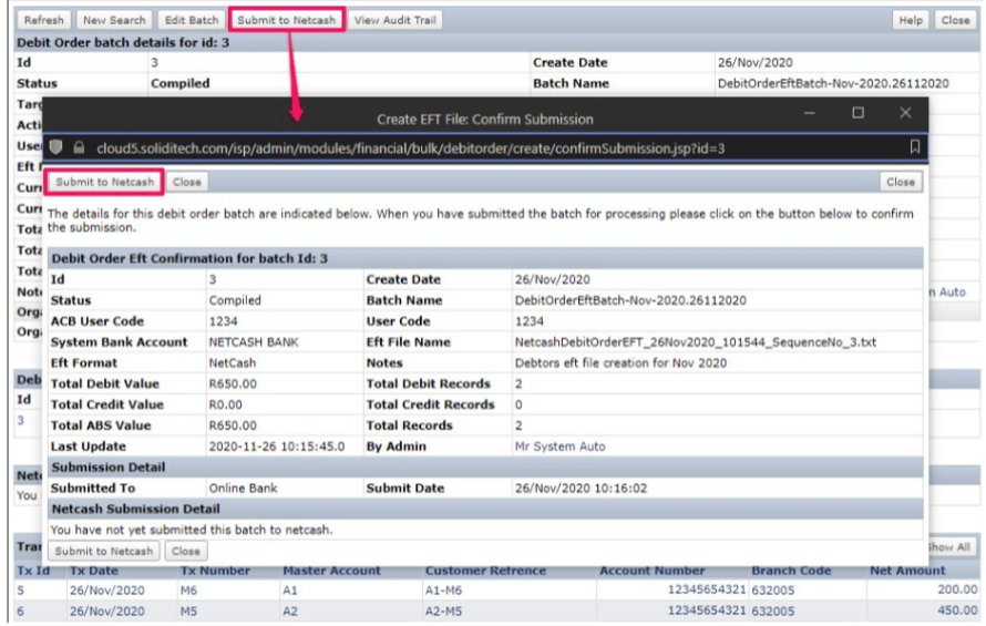 Review the batch created and submit to Netcash