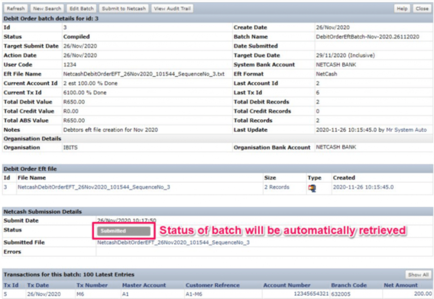 Once the batch submission status is showing “Completed”, the batch will appear on your Netcash account.