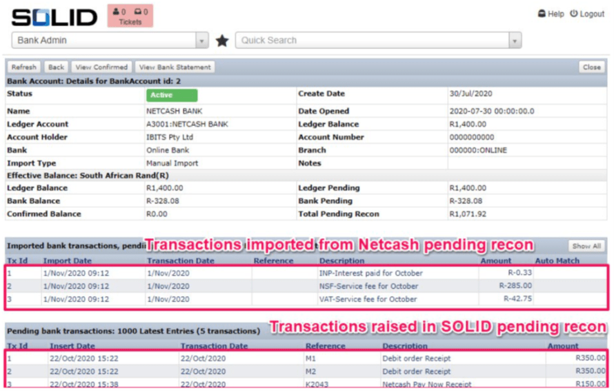 Statement processing and reconciliation is really a sub-function of Debit Orders and Pay Now submissions. Netcash is modelled as a bank account in its own right in the SOLID system. A statement is pulled and processed daily using the “Account service” key. The receipts raised by the debit order batch creation process will be automatically matched to either settlement or rejection lines in the statement. In the case of rejections, the receipt raised when the batch was created will be reversed. All receipts raised via the Pay Now process will also be automatically matched.