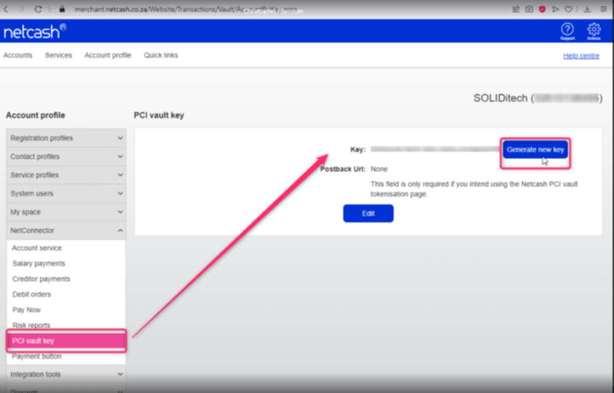 Netcash, navigate to Account Profile > PCI vault key> Click Generate new key
