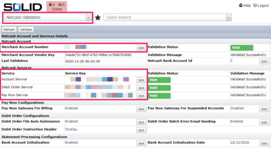 Once each key listed above has been enabled on the Netcash Merchant portal, you then need to configure the keys on SOLID.