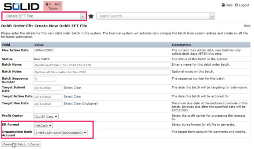 SOLID has a module for debit order batch creation called “Create EFT File”. Select Eft Format of “NetCash” and Organisation Bank Account of “NETCASH BANK” for automated debit order submission