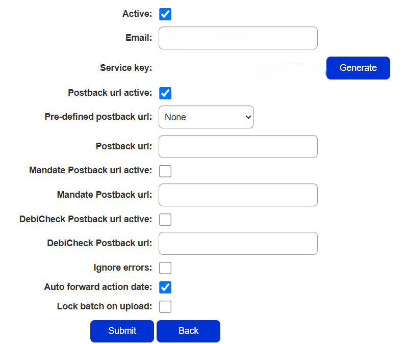 This service key is used to validate bank account information that you capture against customer accounts, as well as pull statements from Netcash for reconciliation purposes.