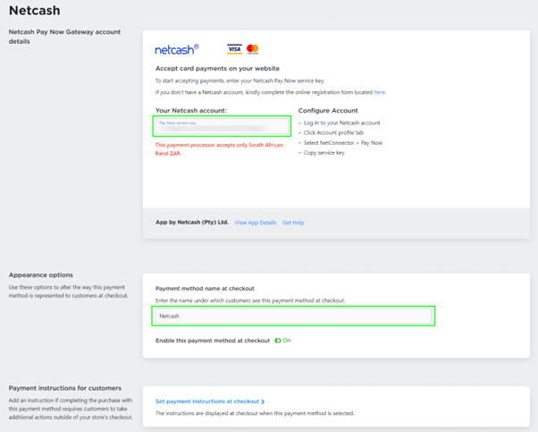 - Copy your unique service key from your Netcash account and paste it in the field provided